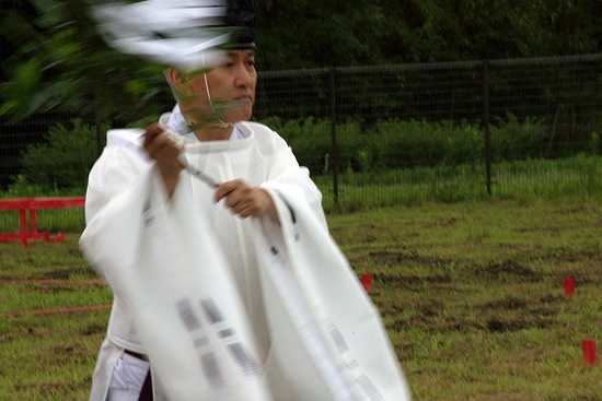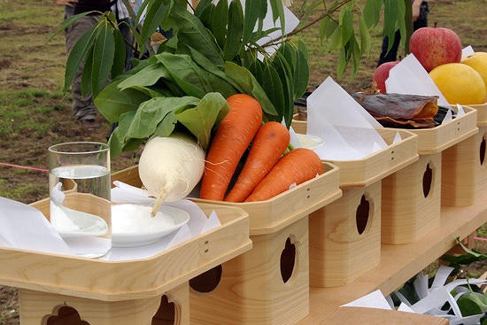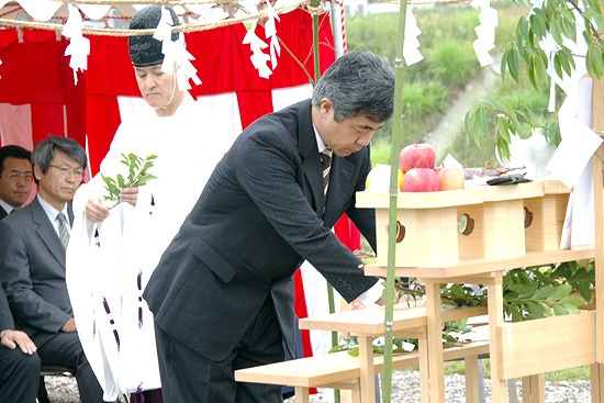 2.祭壇にあるお供え物を供え、工事が何事も無く済むように祝詞 ( のりと ) を唱える。