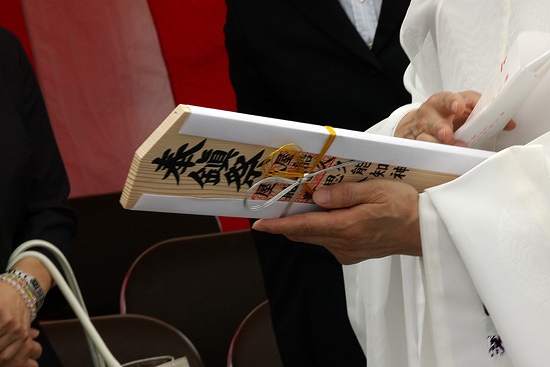 2.祭壇にあるお供え物を供え、工事が何事も無く済むように祝詞 ( のりと ) を唱える。
